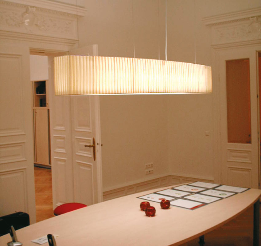 Hightech-Licht im zeitgemäßen Design; direktes und indirektes Licht für Tisch und Raum. Hohe Lichtausbeute durch 4 x 80 W T5 Leuchtstoff.