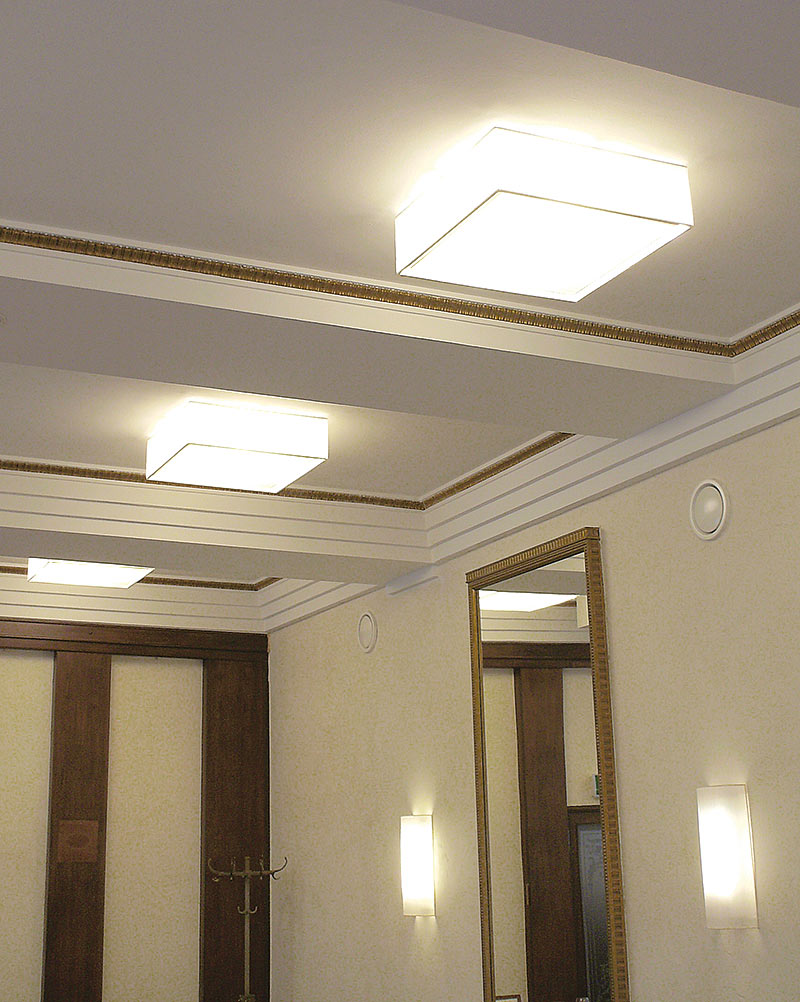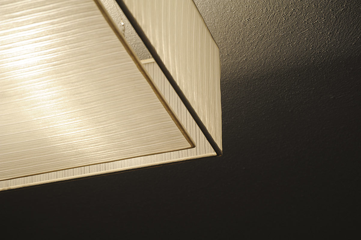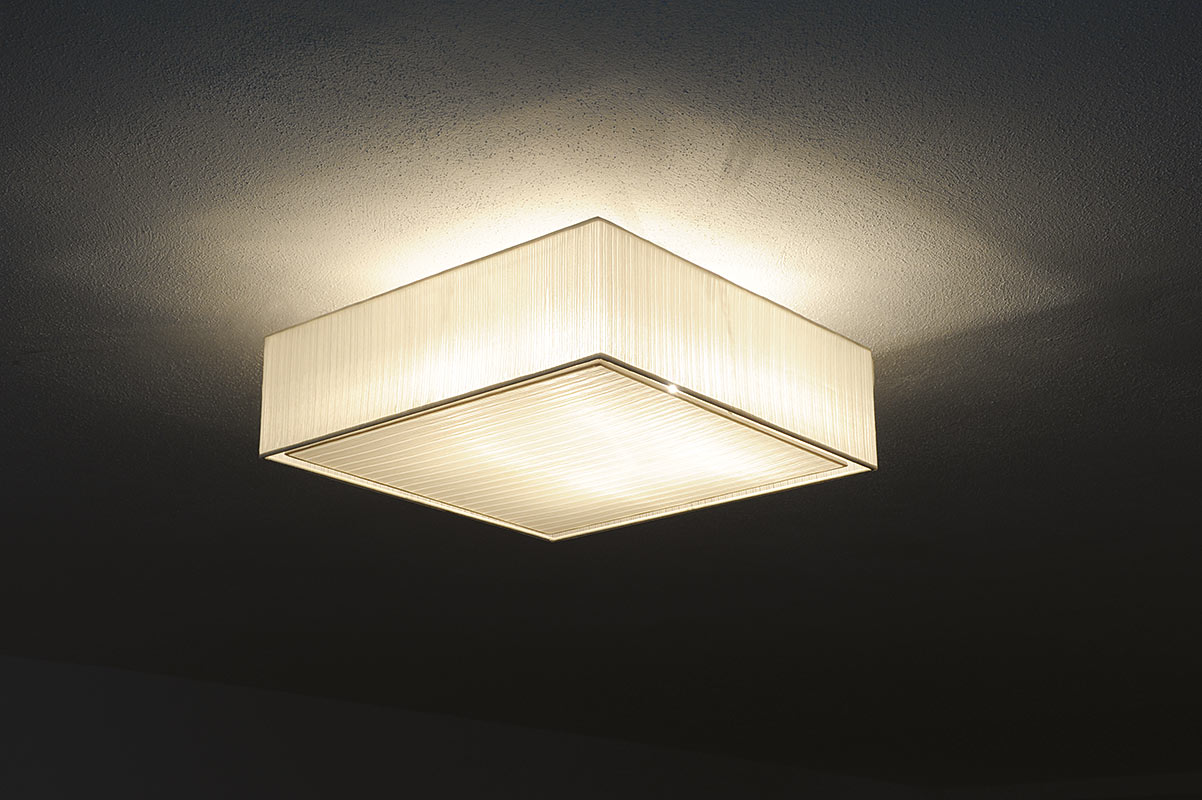 Quadratische Deckenleuchte aus gut lichtdurchlässigem Organza mit koronaartigem Lichtaustritt. Zur Wartung kann sowohl der Schirm als auch die untere Abdeckung bequem abgenommen werden. Wahlweise bestückbar mit Halogen-, LED- oder Energiesparlampen.
